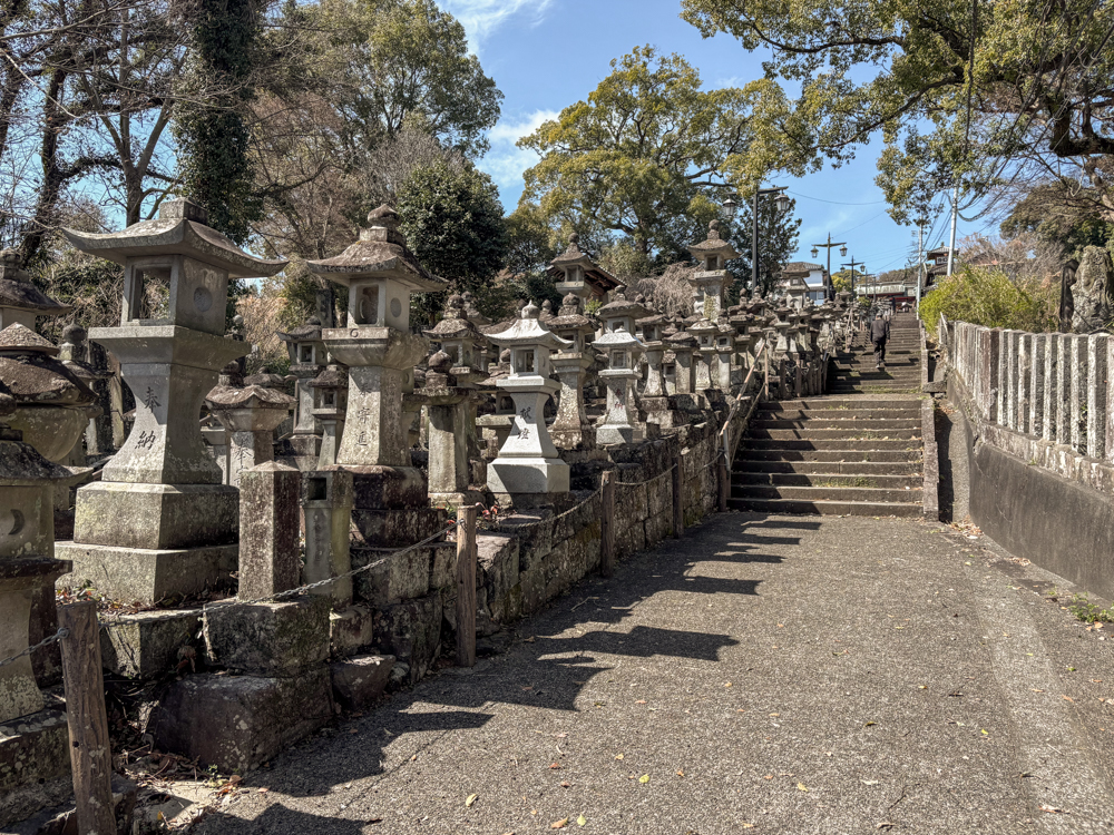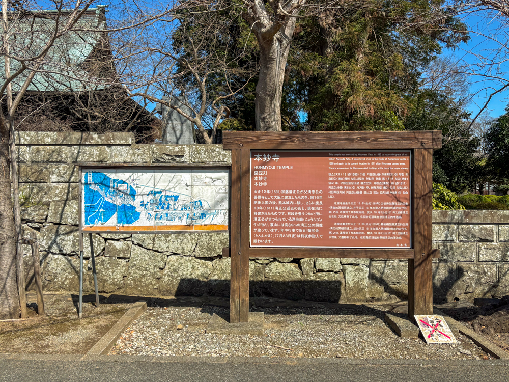山門から続く参道の奥に現れるのが、「胸突雁木(むなつきがんぎ)」と呼ばれる長い石段。中央に石灯籠が並ぶ景観は本妙寺を象徴する風景のひとつで、熊本地震で被害を受けた灯籠も修復が進み、かつての静かな佇まいが少しずつ戻ってきている。