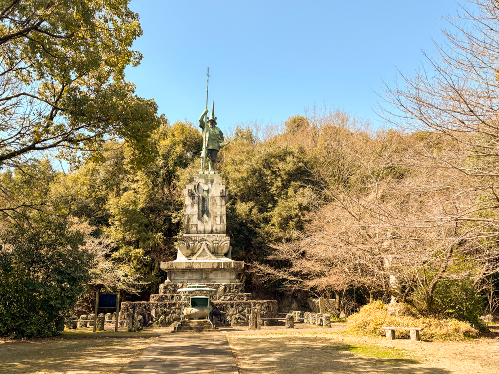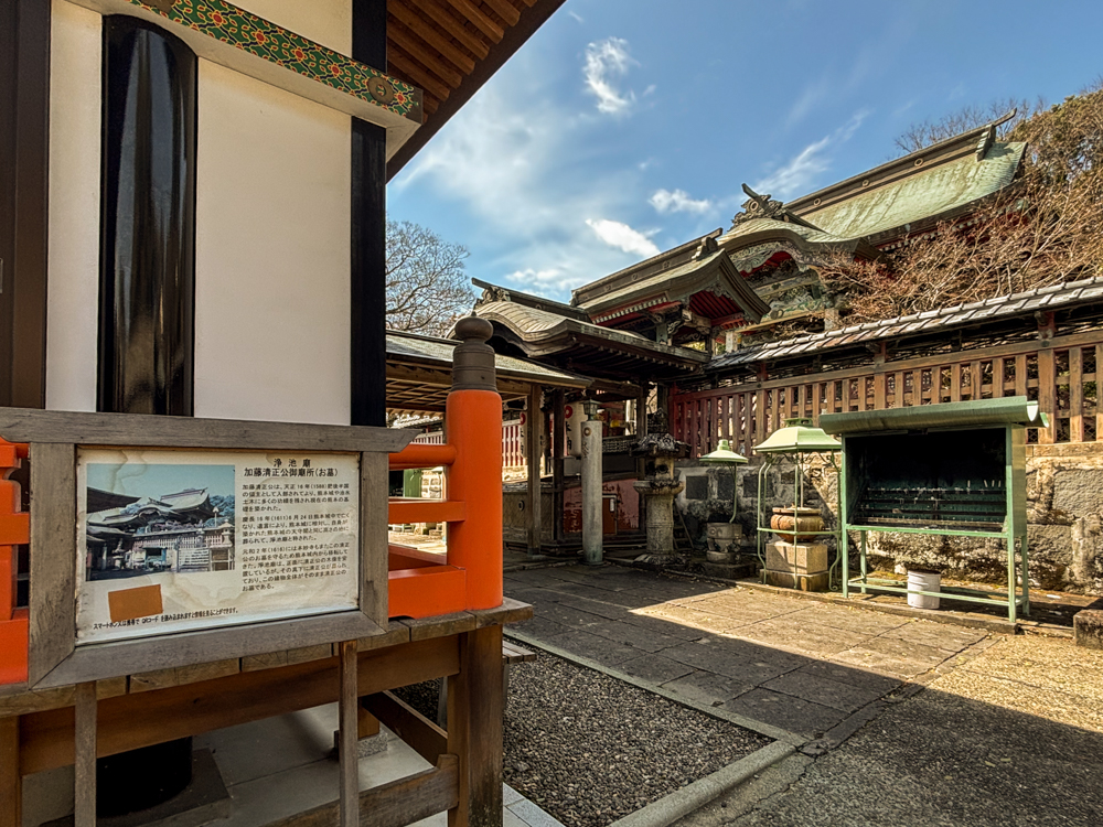 石灯籠を眺めながら石段を上ると、清正公の御廟「浄池廟(じょうちびょう)」へ。そのさらに上には、熊本のまちを見守るように立つ清正公の銅像がある。春には参道や石段周辺に桜が咲き、熊本を代表する花見の名所としても親しまれてきた。