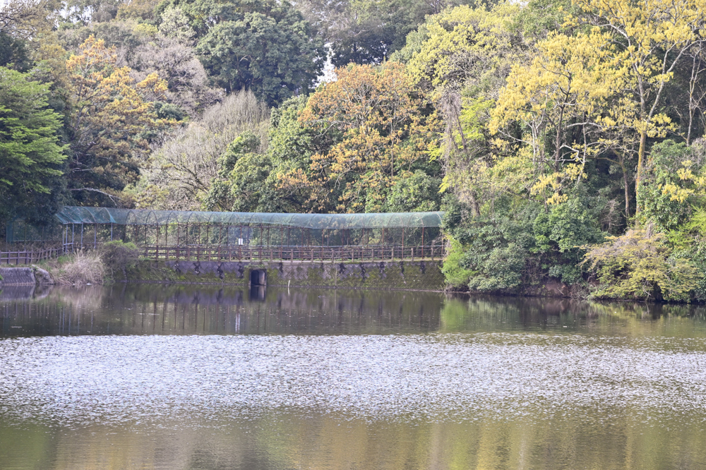 春になると、池のほとりに咲く桜が水面に映り込み、もうひとつの景色をつくり出す。