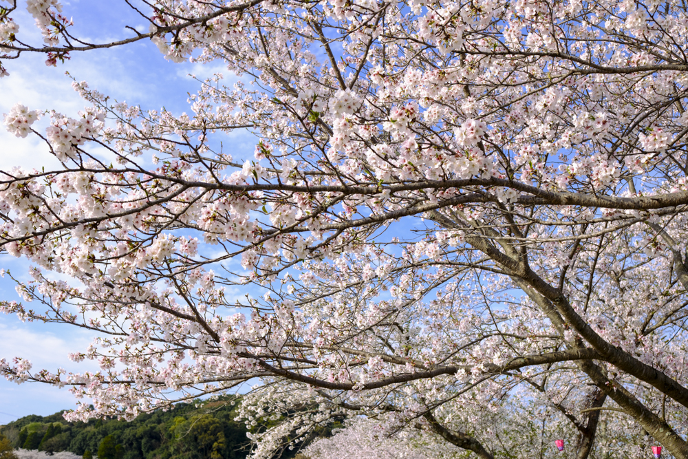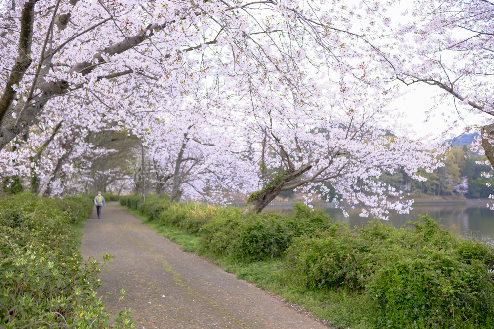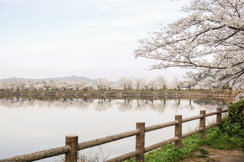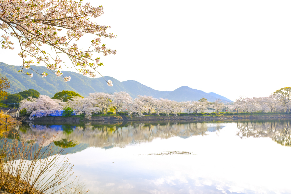 宇土市にある立岡自然公園は、加藤清正が築いたと伝わる立岡池と、江戸末期に完成した花園池を囲むように、約2000本の桜が並ぶ県内有数の花見の名所だ。
