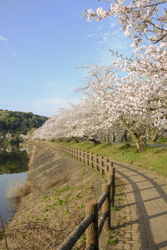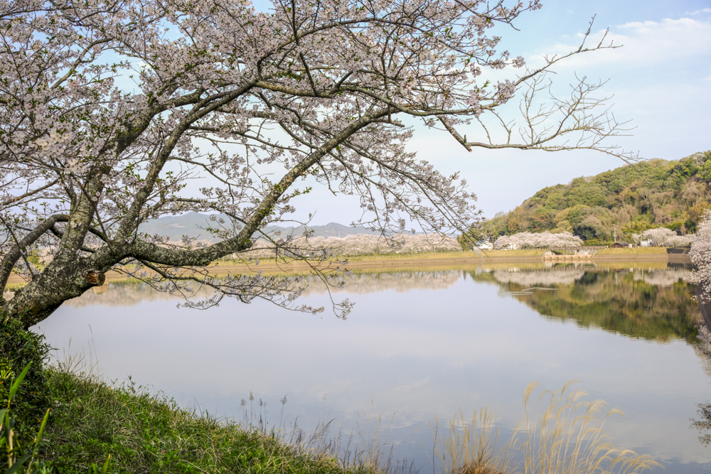 風が穏やかな日には、空と桜と水面が重なり合い、静かな広がりを見せる。
