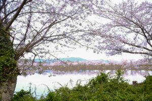 風が穏やかな日には、空と桜と水面が重なり合い、静かな広がりを見せる。