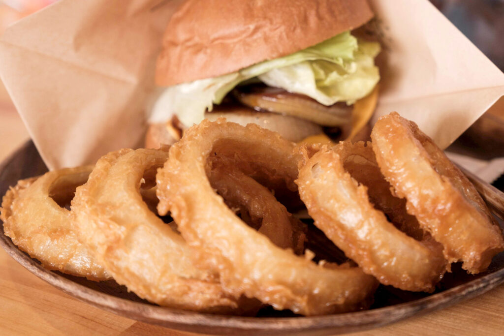 淡路島の契約農家から直送される完熟玉ねぎと、ビーフ100%のパティを豪快に挟んだ人気のグルメバーガー。