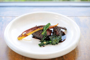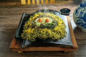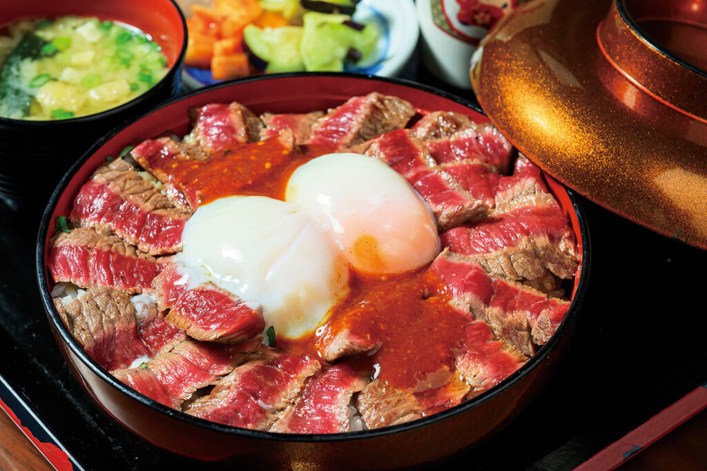 あか牛にトロリとした半熟卵、辛味噌と大葉が絶妙に絡む。
