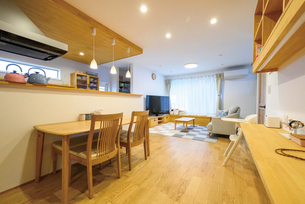 無垢材と珪藻土がつくるやわらかな空気感のリビングは、和室とつながり、家族が自然と集まる広がりがある。
