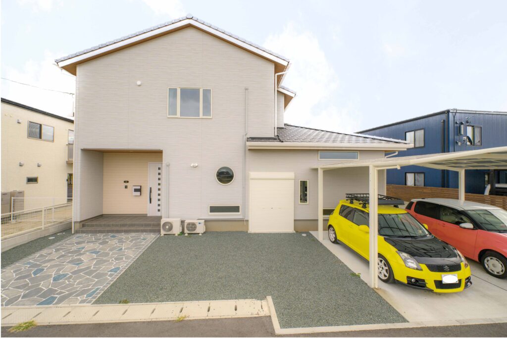切妻屋根の和モダンな外観にガレージを組み合わせた、いろはクリエイトの住まい。