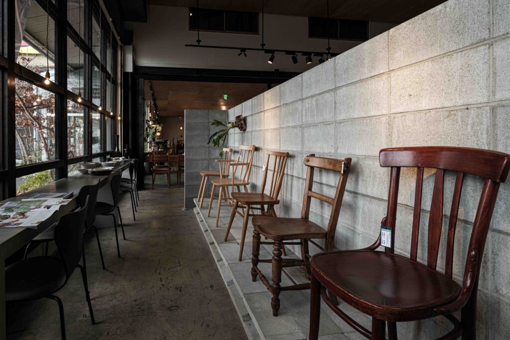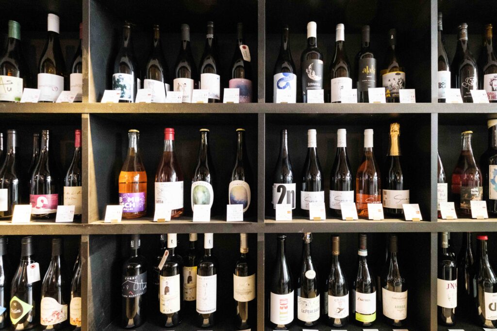 自然派ワインが楽しめる「Wine Bar F」を併設。店頭で購入したボトルをその場で味わうこともできる。家具に囲まれた空間で昼下がりの一杯を。