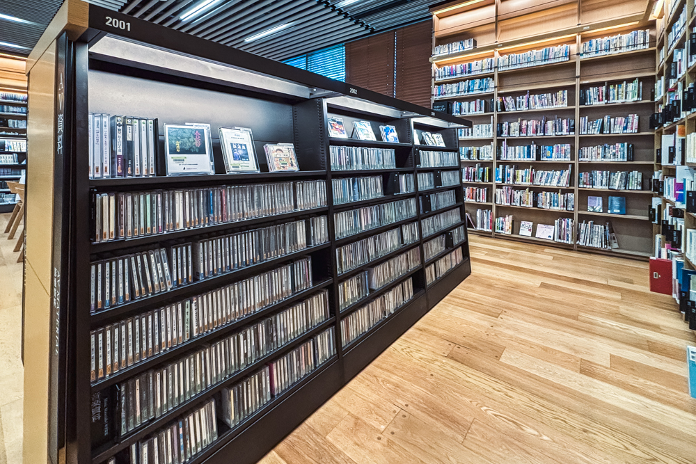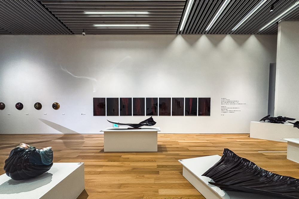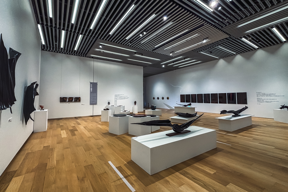大きな本棚が連なる開放的な図書館スペースと、静かに美術作品と向き合える展示室。